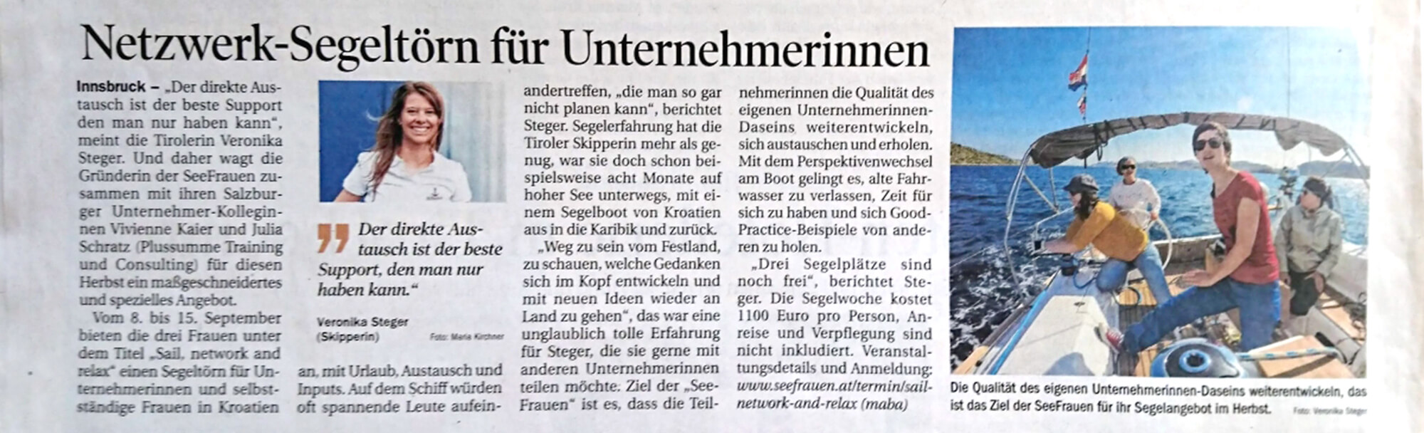 „Unternehmerinnen unter sich“, heißt es beim ersten Netzwerkevent für Unternehmerinnen am Segelboot. Tiroler Tageszeitung. Juli 2018